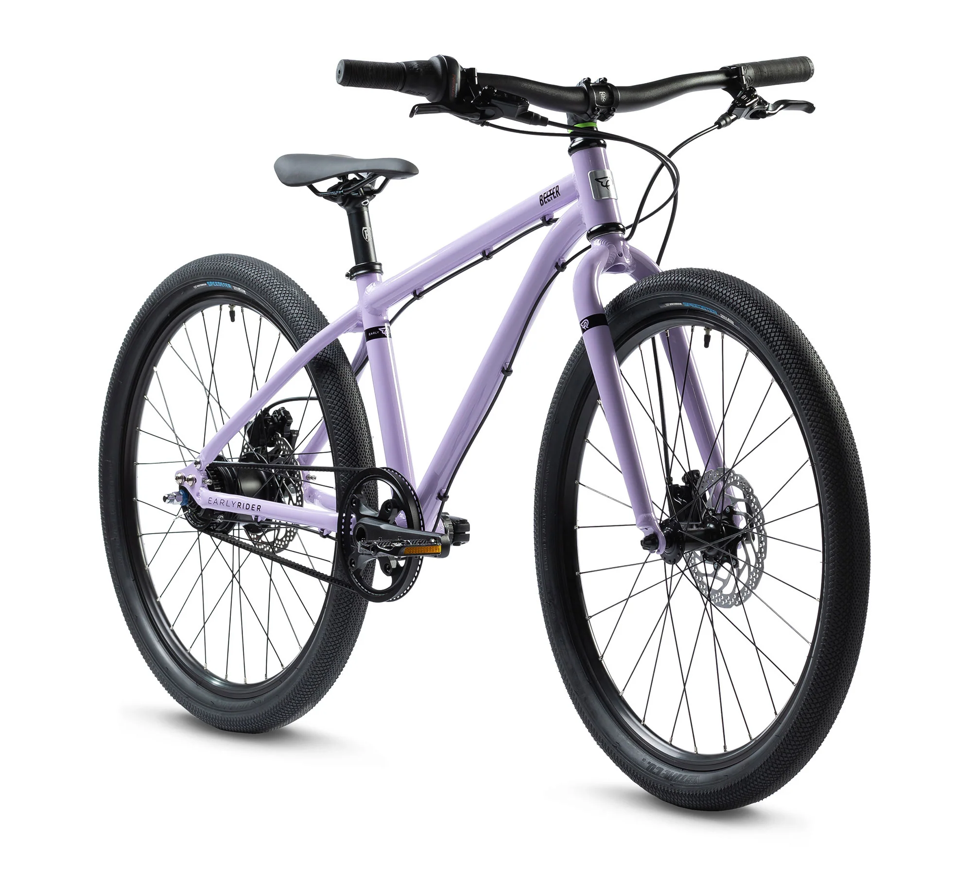 The Belter 24 is stunning, whichever way you look at it, and whenever. A maintenance free Shimano hub and beautifully clean belt drivetrain because winter is hard enough without having to regularly clean out 'mud glue' from derailleurs and clean clothes smeared by greasy chains or speared by grimy rings. An incredible 310% gear range provided by 8 evenly spaced gears because our 10-going-on-20 year olds like to go places, fast, no matter what's in the way. Instant changing to any gear you want, whether pedalling or not for those stop start urban rides, try that with a derailleur and see how far you get.